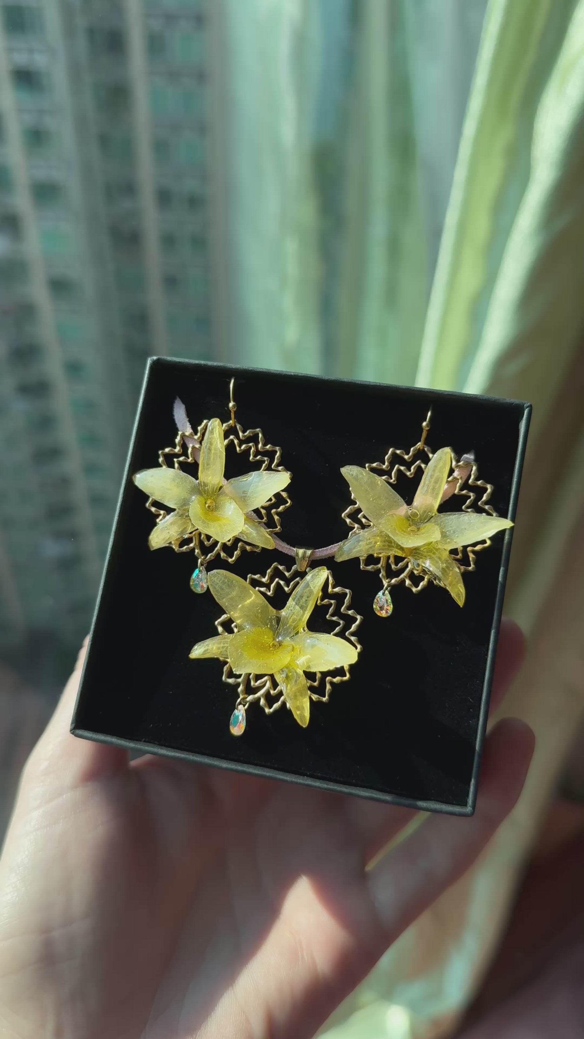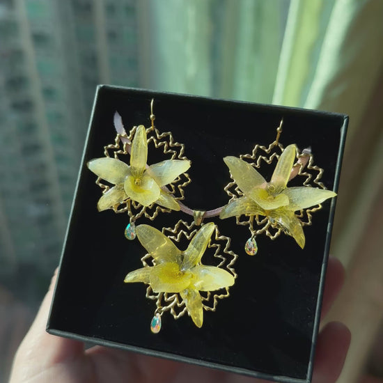 A unique jewelry set featuring delicate flowers preserved in UV resin, framed by intricate golden details. The set includes: