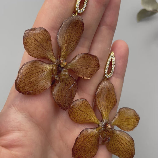 Elegant earrings featuring real dried orchids, preserved in UV resin to highlight their natural beauty. The gold-plated copper hardware with cubic zirconia accents adds a luxurious finish.