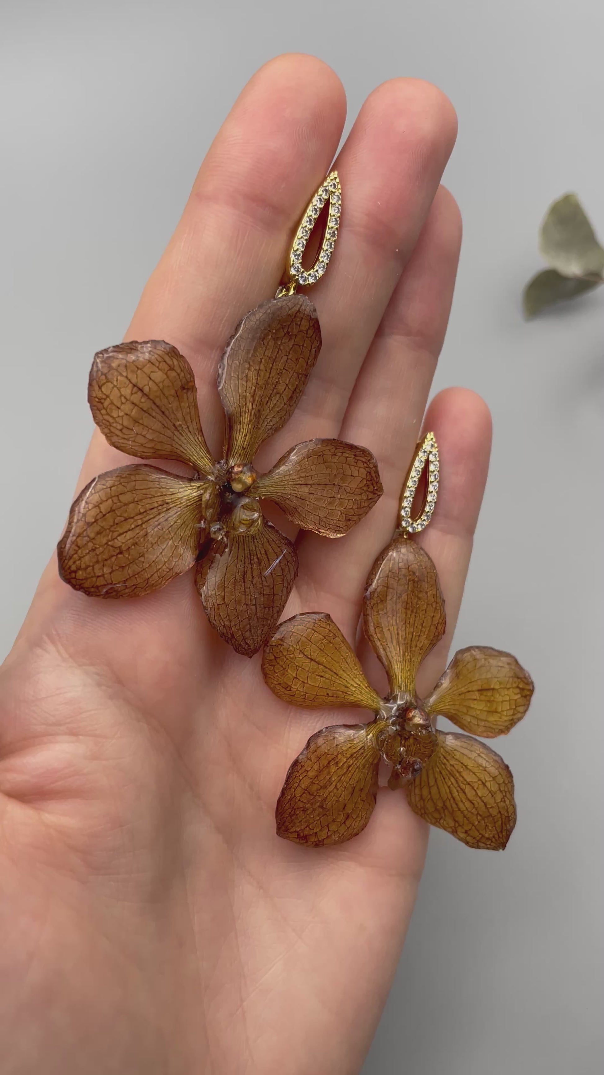 - Materials: Real dried orchids, UV resin, gold-plated copper, cubic zirconia