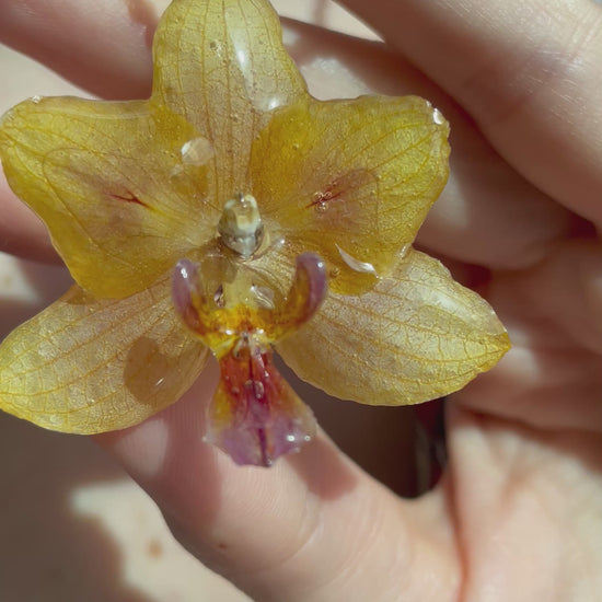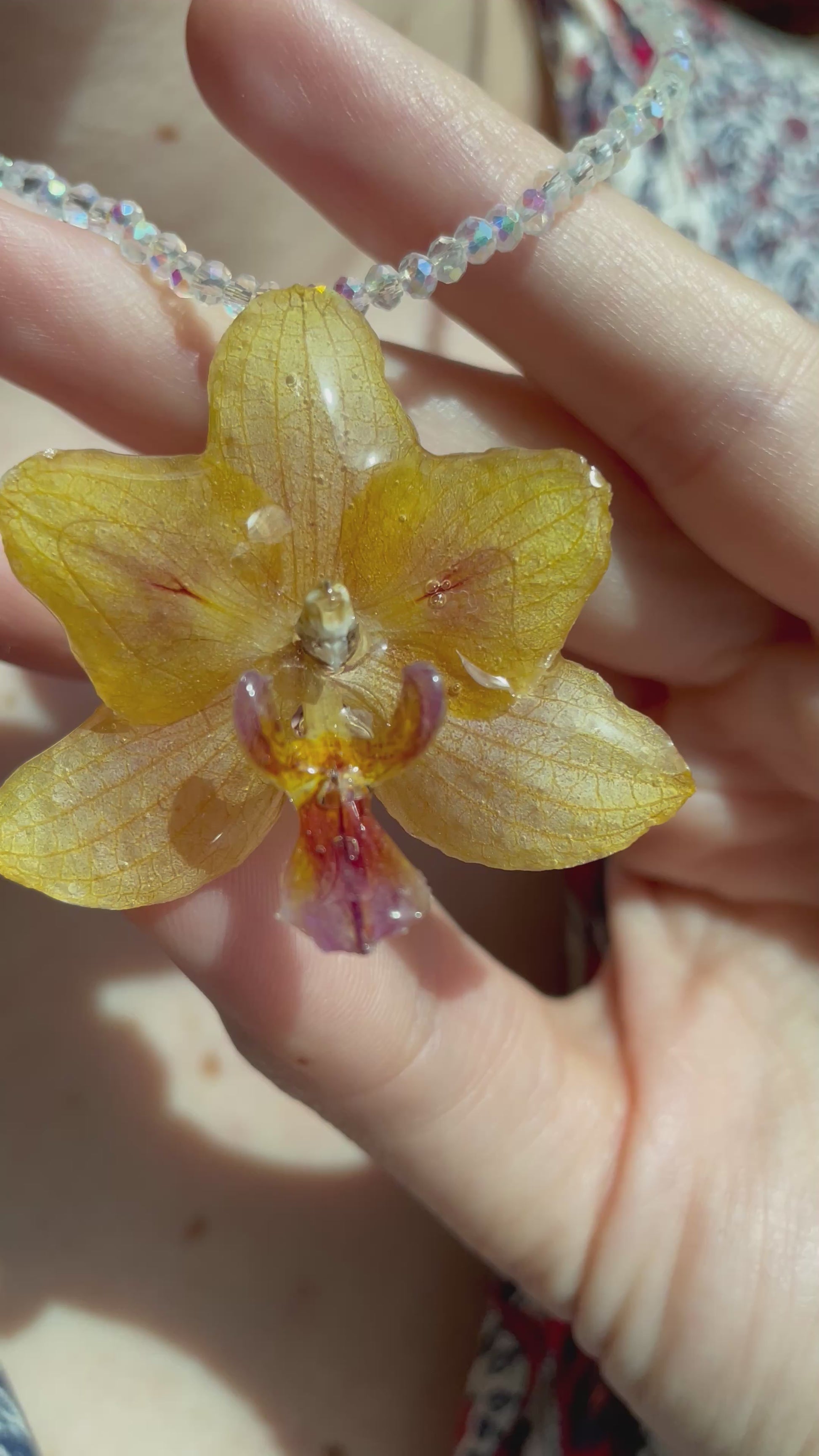 This handcrafted necklace showcases a real dried orchid, preserved in UV resin to emphasize its warm golden tones and delicate structure. Complemented by shimmering glass beads and a stainless steel clasp, it offers a unique blend of natural beauty and timeless elegance. Perfect for adding a subtle yet striking accent to any outfit.