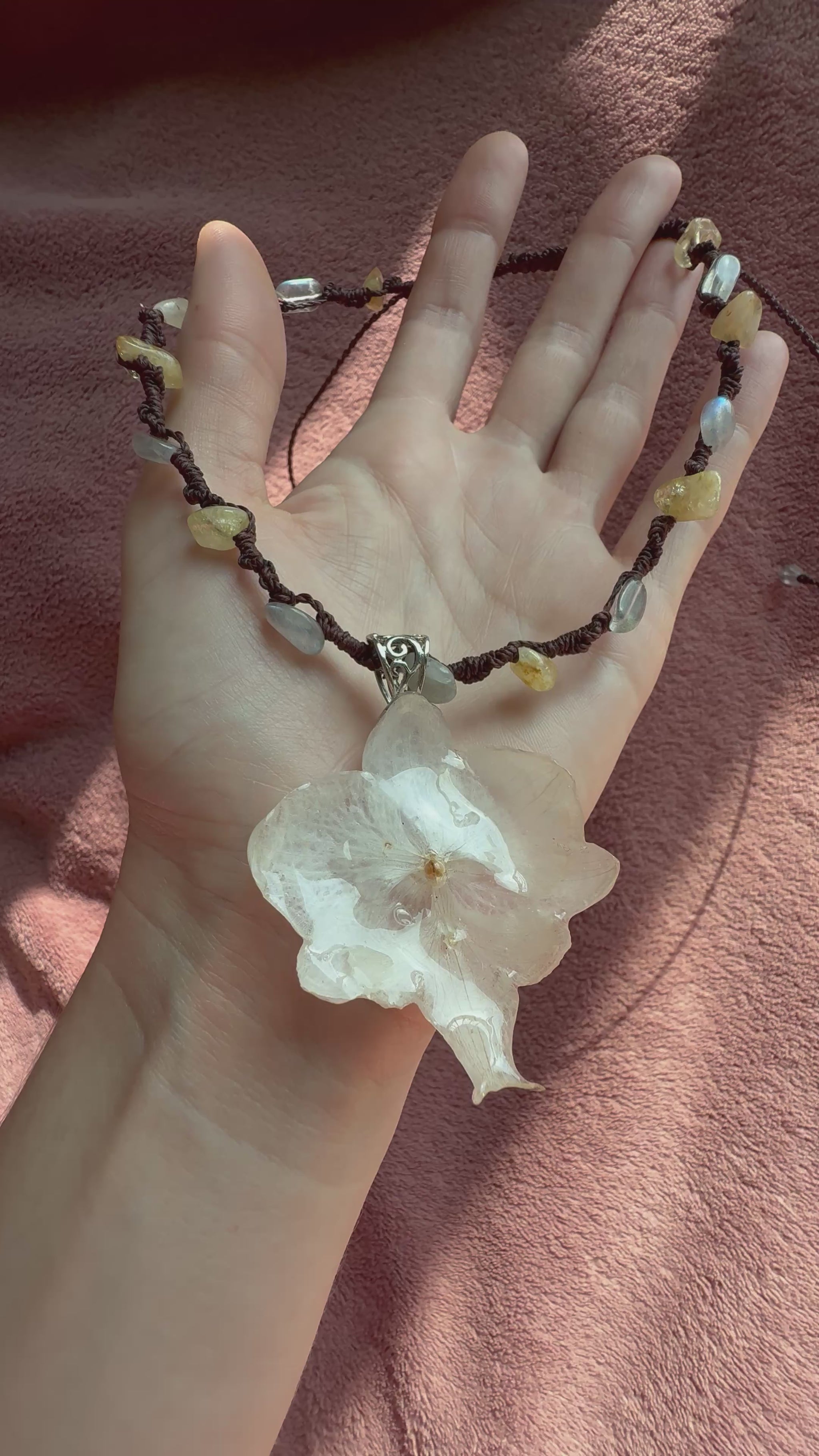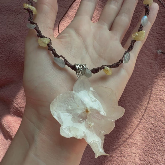 A unique handcrafted necklace with a natural orchid pendant, citrine, and labradorite stones.